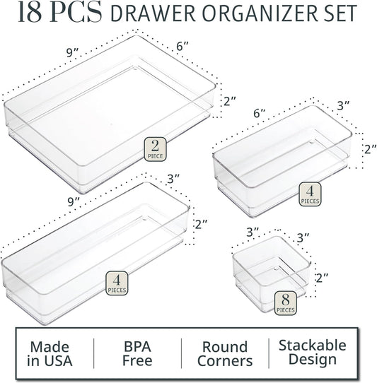 Simplesort 18-Piece Stackable Clear Drawer Organizer Set | Multi-Size Trays | Makeup Vanity Storage Bins and Office Desk Drawer Dividers | Made in USA